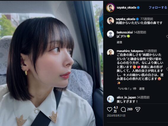 鼻については、本人が「両親からいただいた自慢の鼻」とSNSで投稿しています。