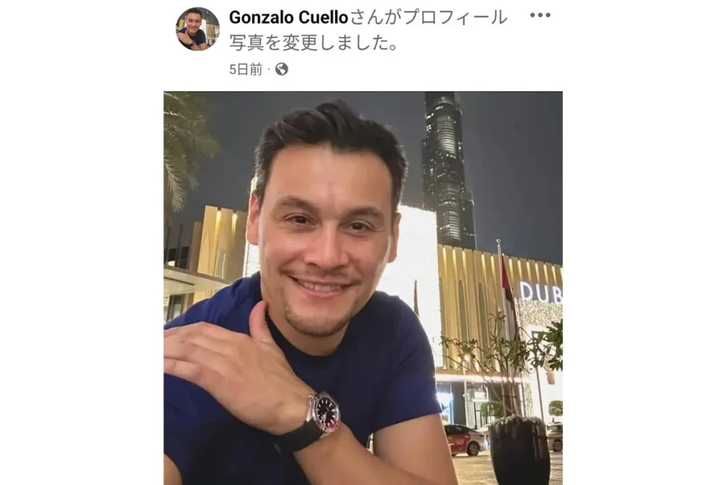 そこには、ドバイと思しき夜景を背景にした笑顔のゴンサロ氏が…。